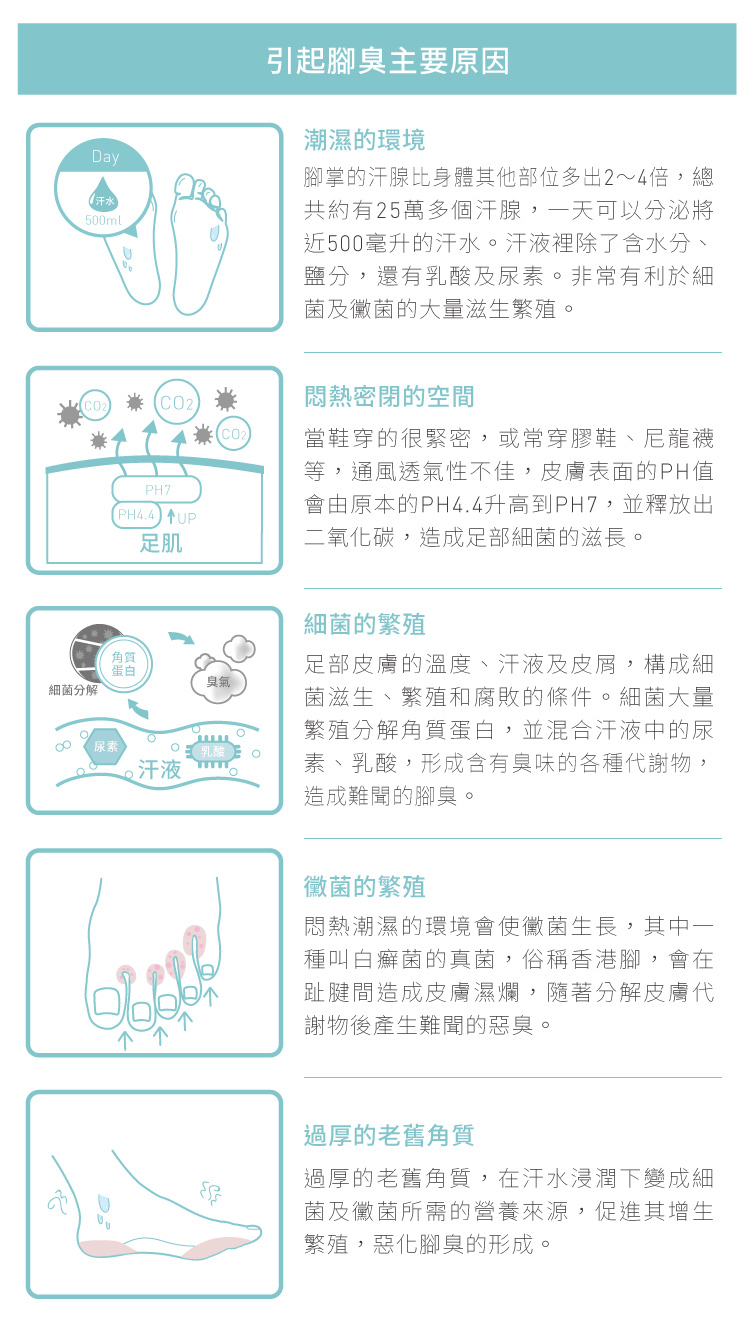 由於腳心比其他部位的汗腺多。腳心每平方厘米有620個左右汗腺,而身體其他部位同樣面積僅有143~339個。當人們活動增多、天氣悶熱、精神緊張、吃辛辣熱燙食物的時候,汗液就會大量分泌出來。出汗後鞋內的濕度和酸鹼值給細菌提供了一個適宜的生長環境,加上皮膚壞死的角質層給細菌帶來的足夠的營養,使細菌能夠大量繁殖分解角質蛋白並混合汗液中的尿素、乳酸產生難聞的臭味。