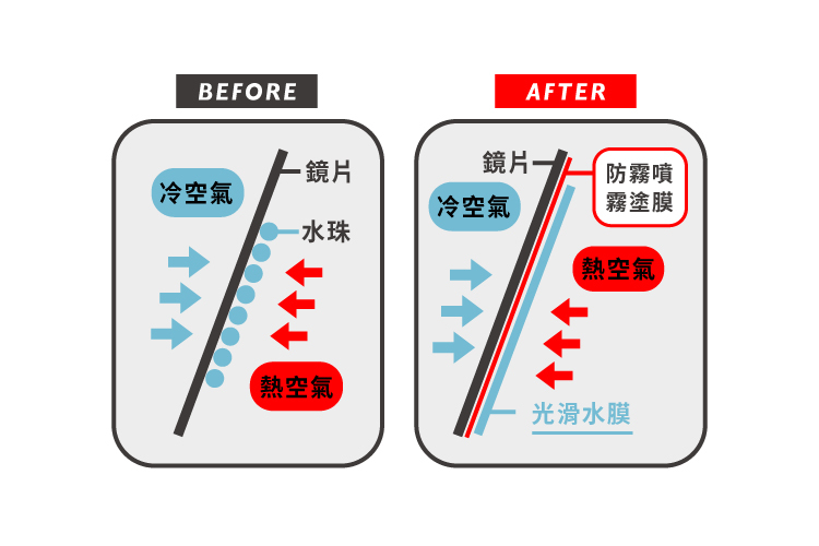 防霧劑可降低水珠的表面張力,讓大量水氣形成一整片的透明水膜,