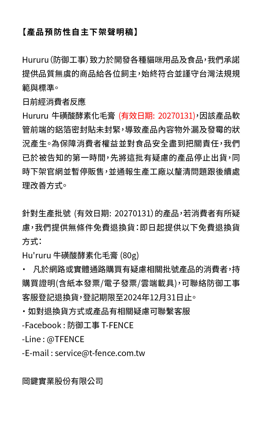 Hu'ruru 牛磺酸酵素化毛膏 產品預防性自主下架聲明