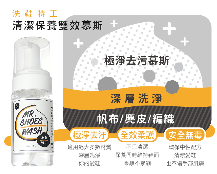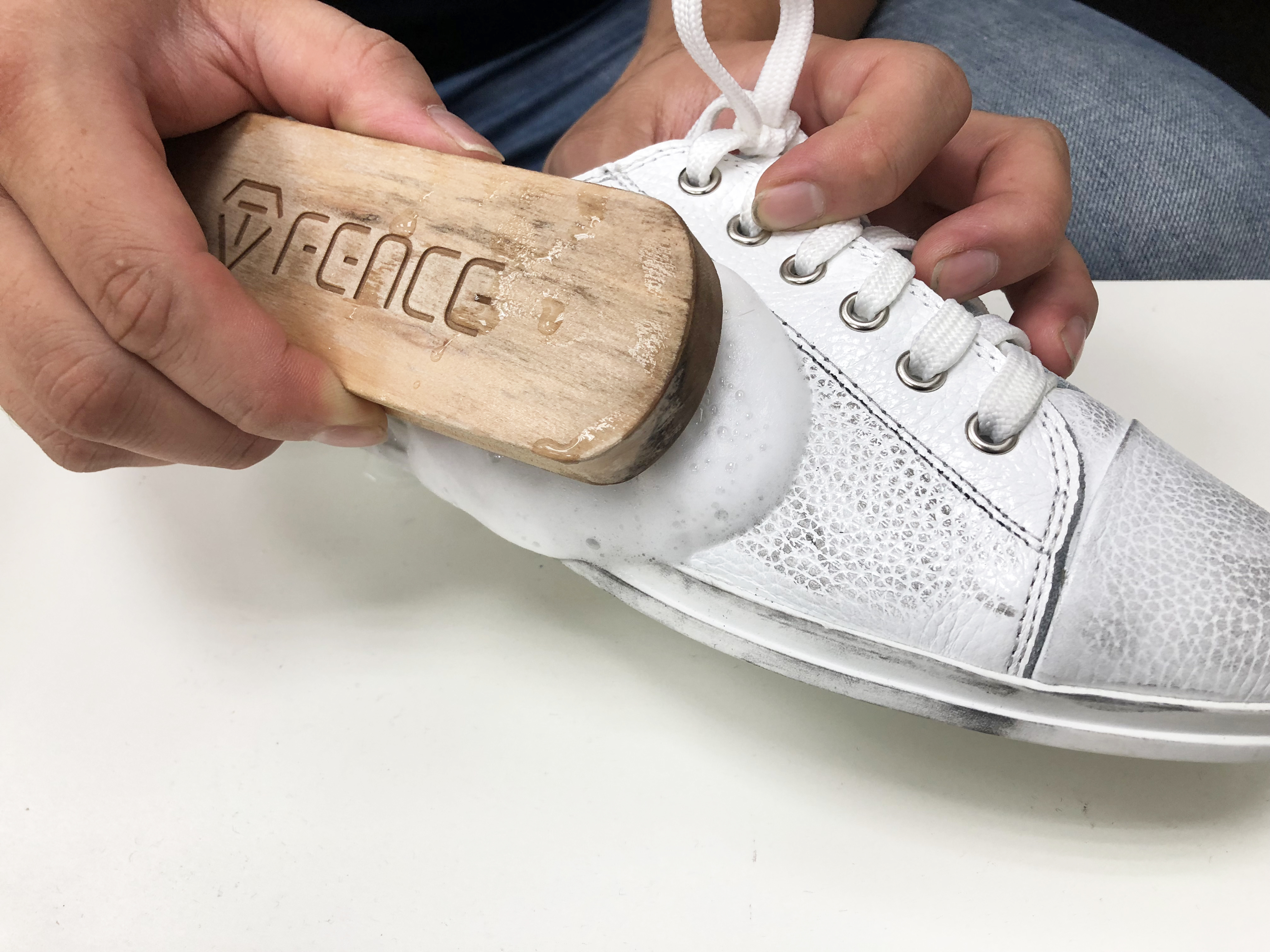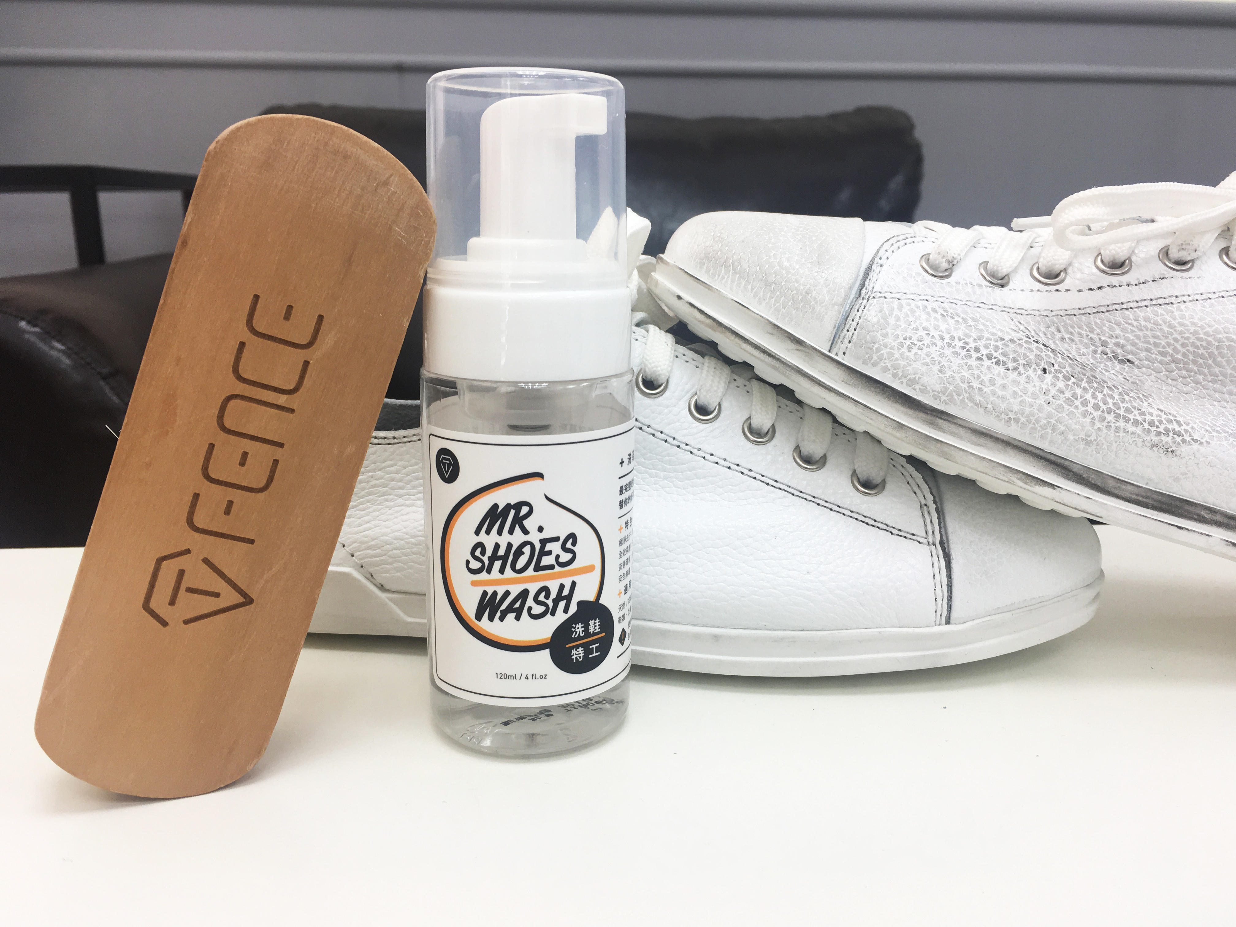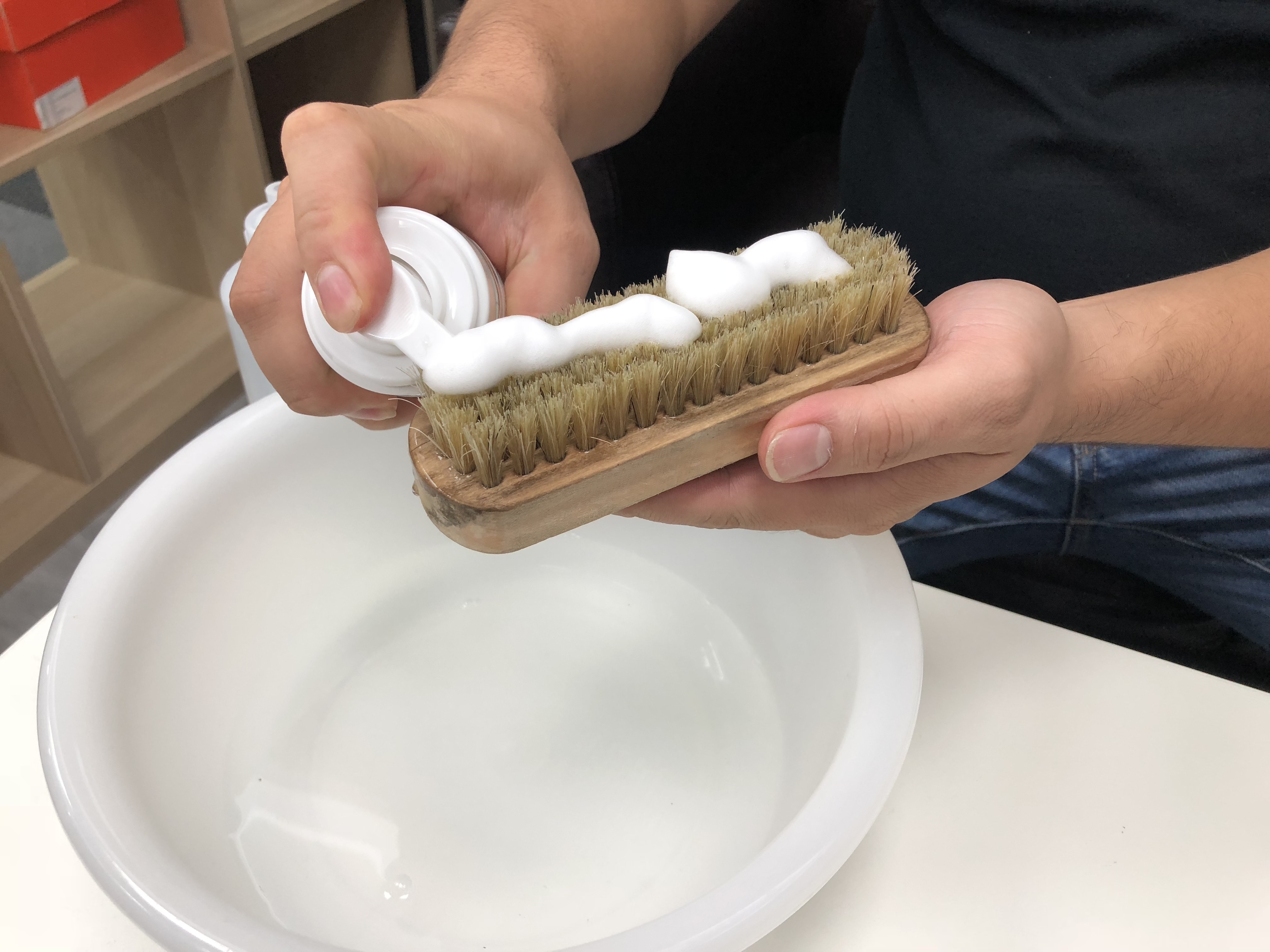 將洗鞋特工擠壓出泡沫於鬃毛刷上,1~2下即可。
