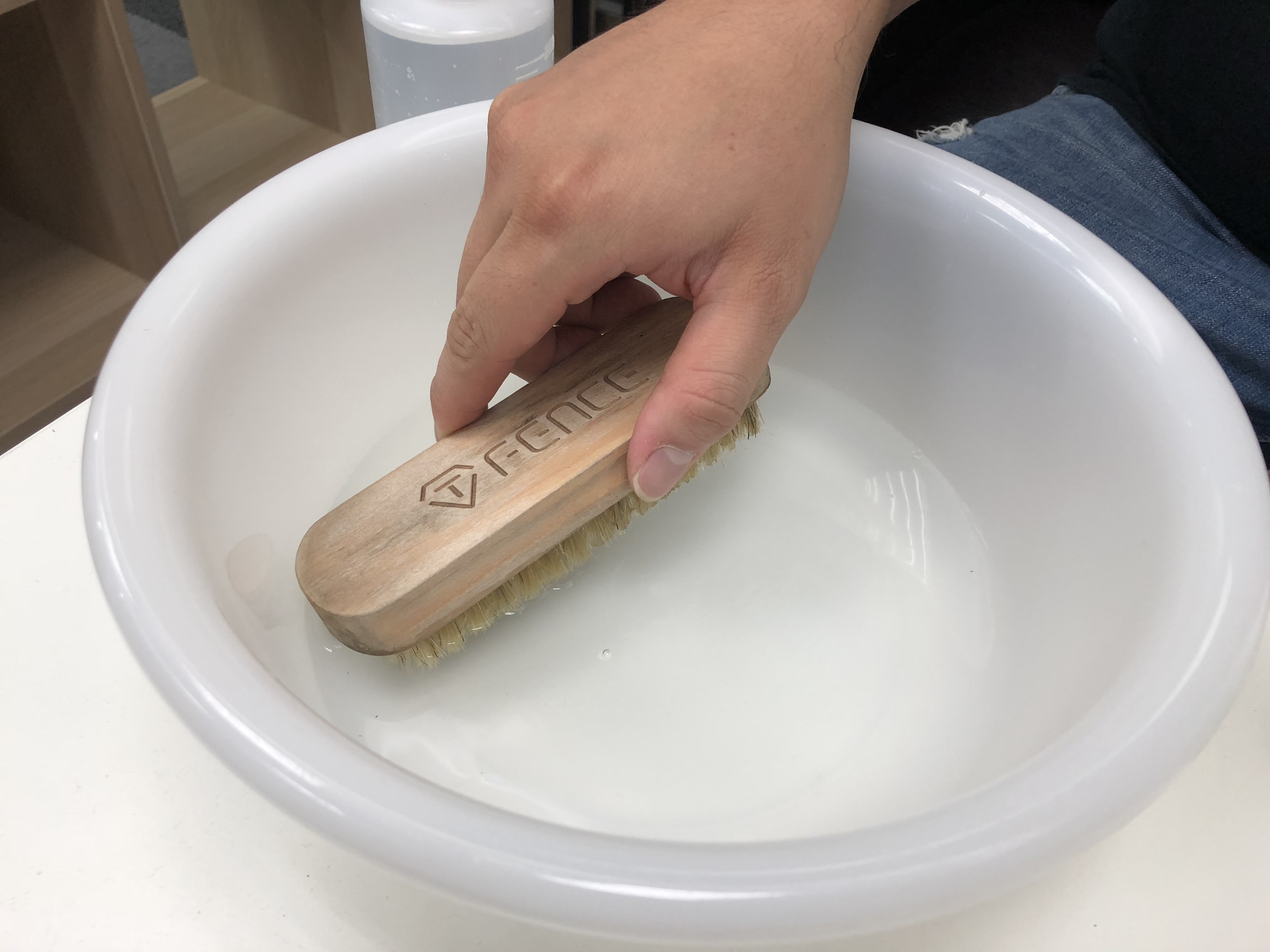 先將洗鞋特工組合中附上的鬃毛刷沾溼。
