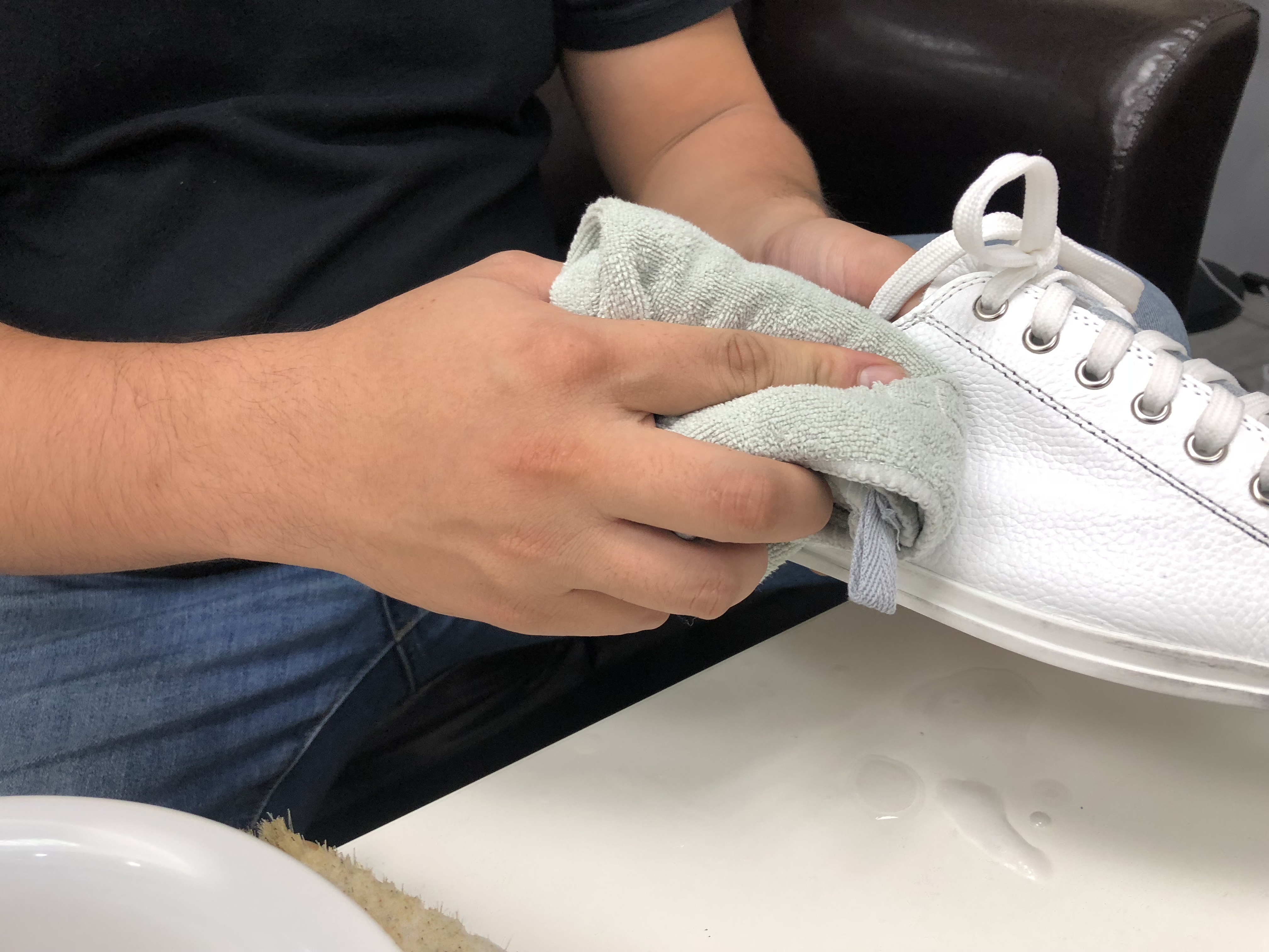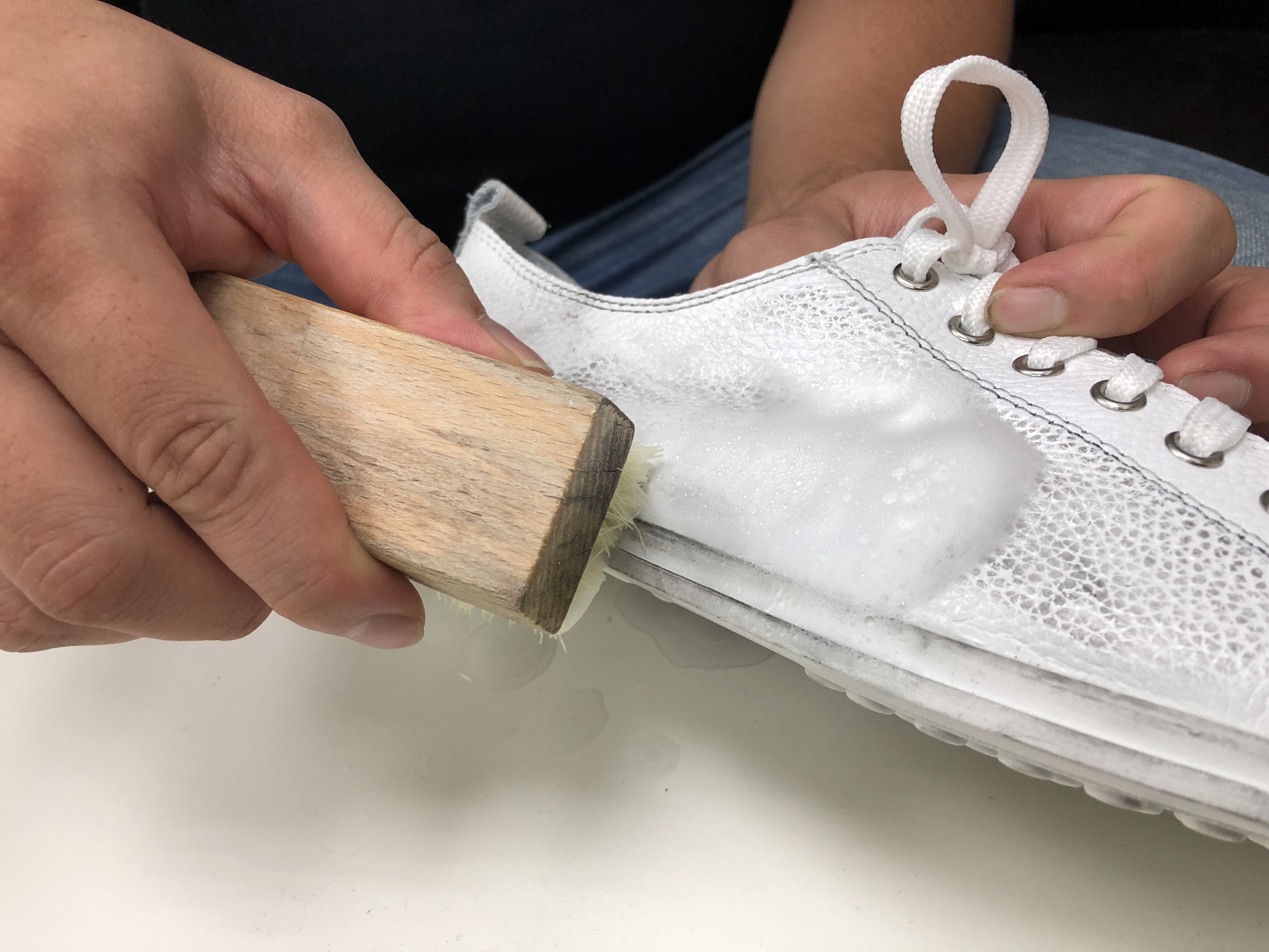 先使用洗鞋特工中附的鬃毛刷,以畫圓方式在鞋面上反覆刷洗。