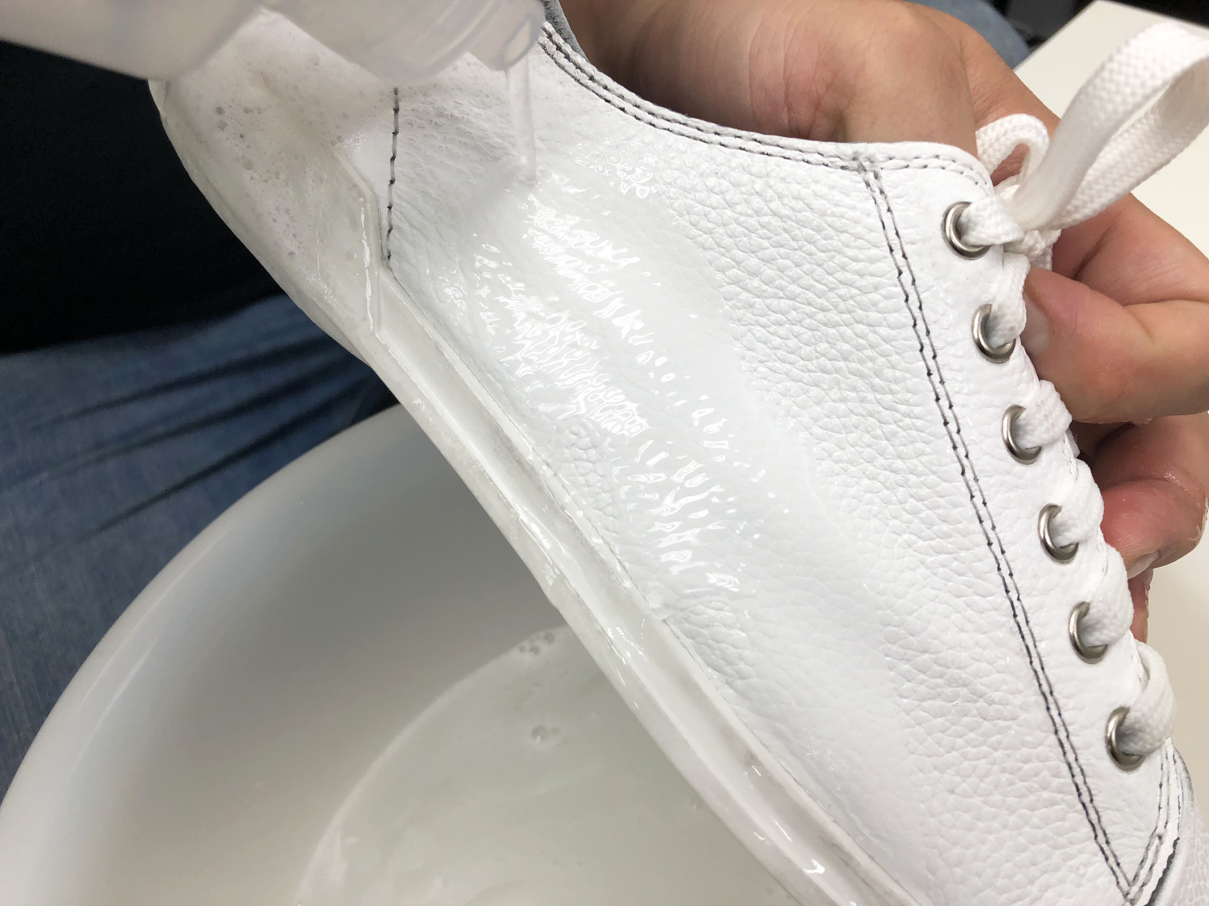 用清水將刷洗完的鞋反覆沖洗乾淨。