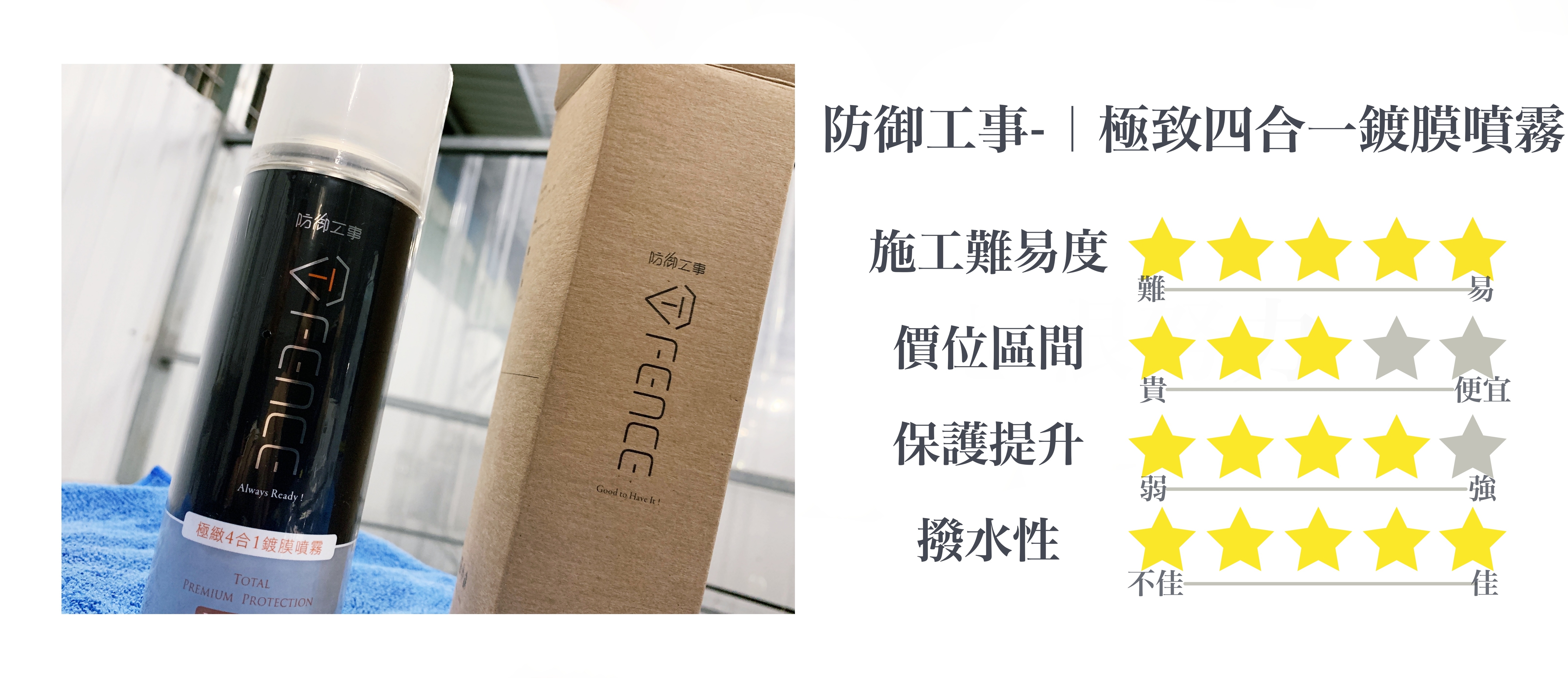 施作時要保持一點距離,剛噴出來的味道真的滿重的,接下來就拿乾淨的布擦拭至光亮,一定要乾淨的布,不然受到髒污污染也是會鍍膜失敗的。施做完靜置30分鐘再移動比較好(官方建議最佳為三小時)以鍍膜的長效以及保護層來說,四合一鍍膜噴霧是優於水鍍膜的,所以也可以先施作四合一鍍膜噴霧,次日再施作水鍍膜做維護劑,延長時效。