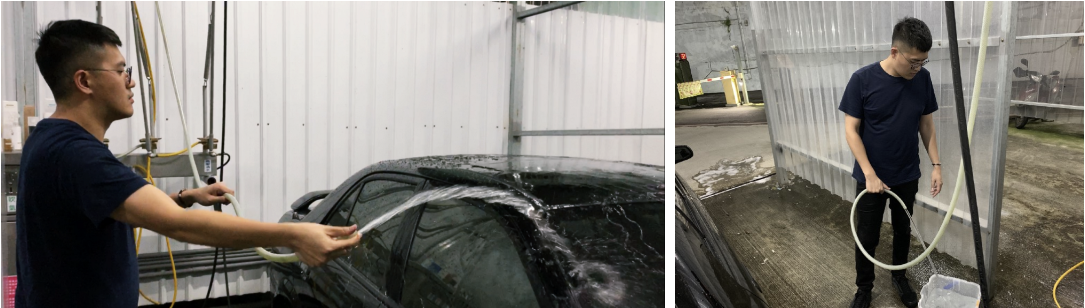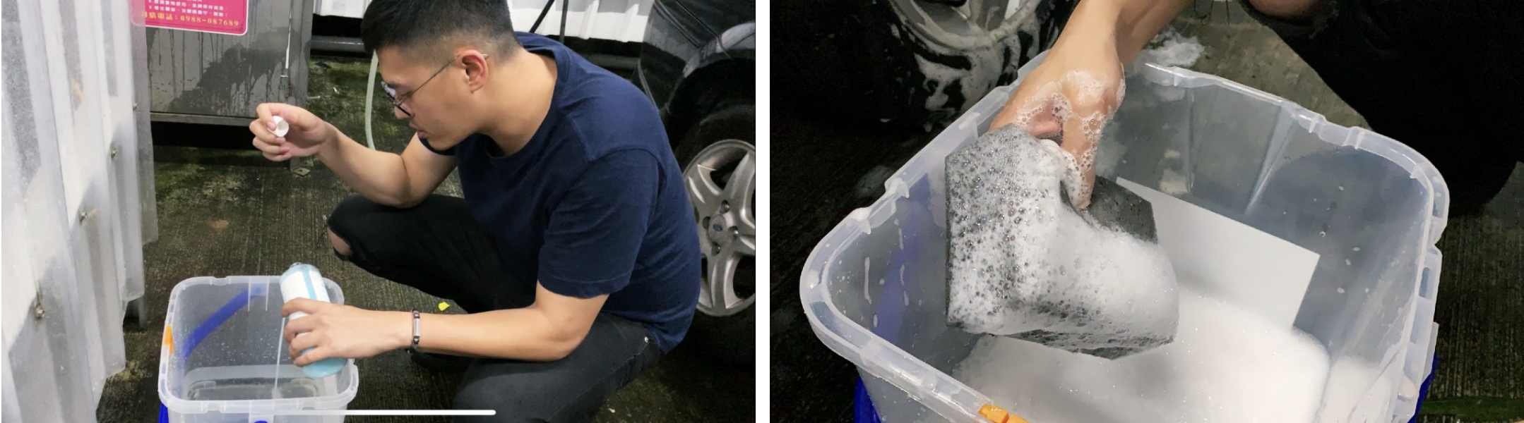 車身可以先使用高壓或者低壓,沖洗砂礫以及灰塵,蓄水的部分是拿來泡軟吸水巾以及稍後混合洗車精使用。