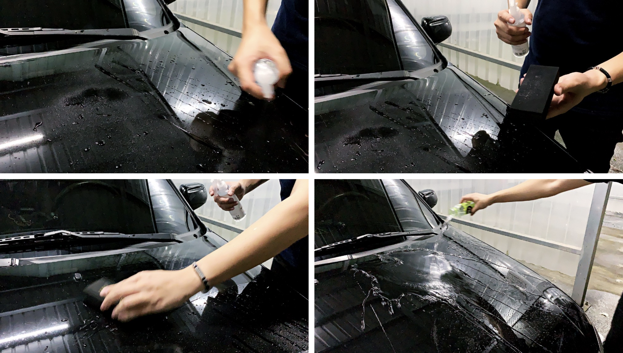 1.施作時切勿在大太陽底下,並且施作時也以鈑件為單位,這麼做是怕藥劑乾燥太快有產生水痕的可能,結晶型產品要清除就會需要清潔蠟了。