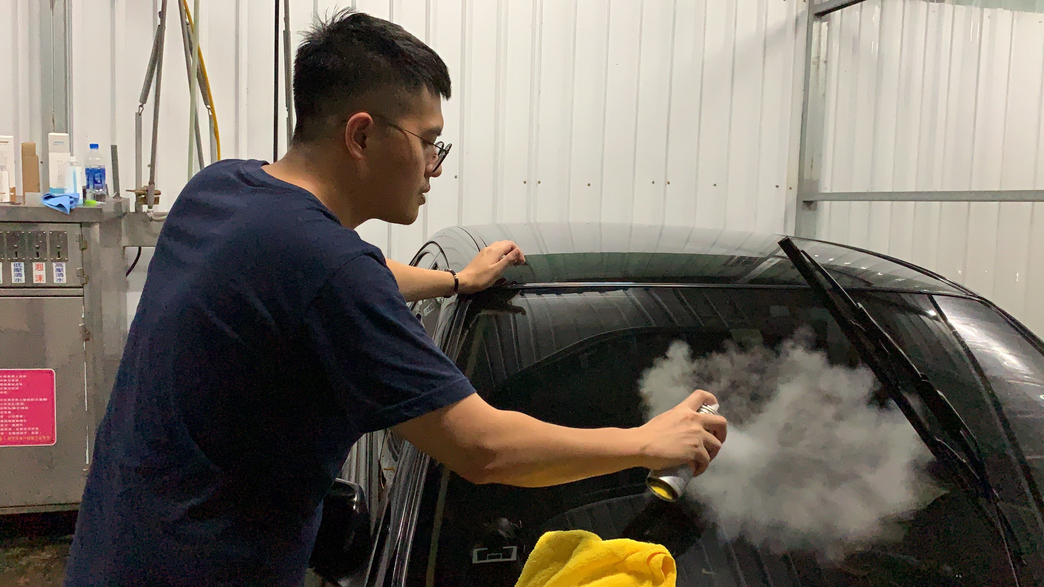 2.施作完一個單位後一定要用水沖乾淨,此產品需要用水來產生反應,如果沒有沖乾淨了話會影響成效,這就是為什麼要續一桶水並且施作時搭配容器,當然全車施工完可以用低壓水管在沖洗一遍,嘗試看看什麼叫用水擦車。